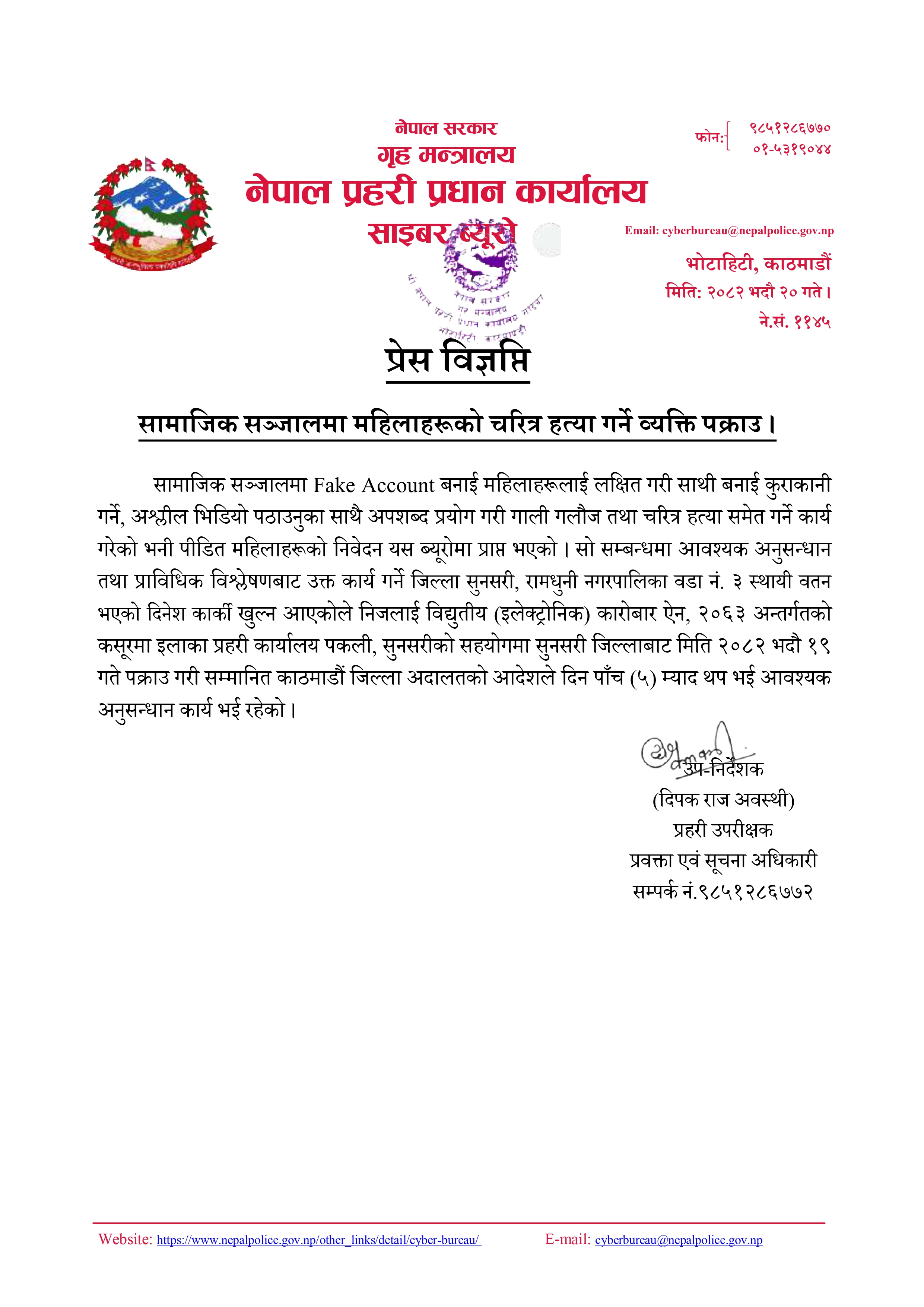 प्रेश विज्ञप्ती २०८२-०५-२० गते । सामाजिक सञ्जालमा महिलाहरुको चरित्र हत्या गर्ने व्यक्ति पक्राउ !! २०८२-०५-२० A A- A+ Share प्रेश विज्ञप्ती २०८२-०५-२० गते । सामाजिक सञ्जालमा महिलाहरुको चरित्र हत्या गर्ने व्यक्ति पक्राउ !!