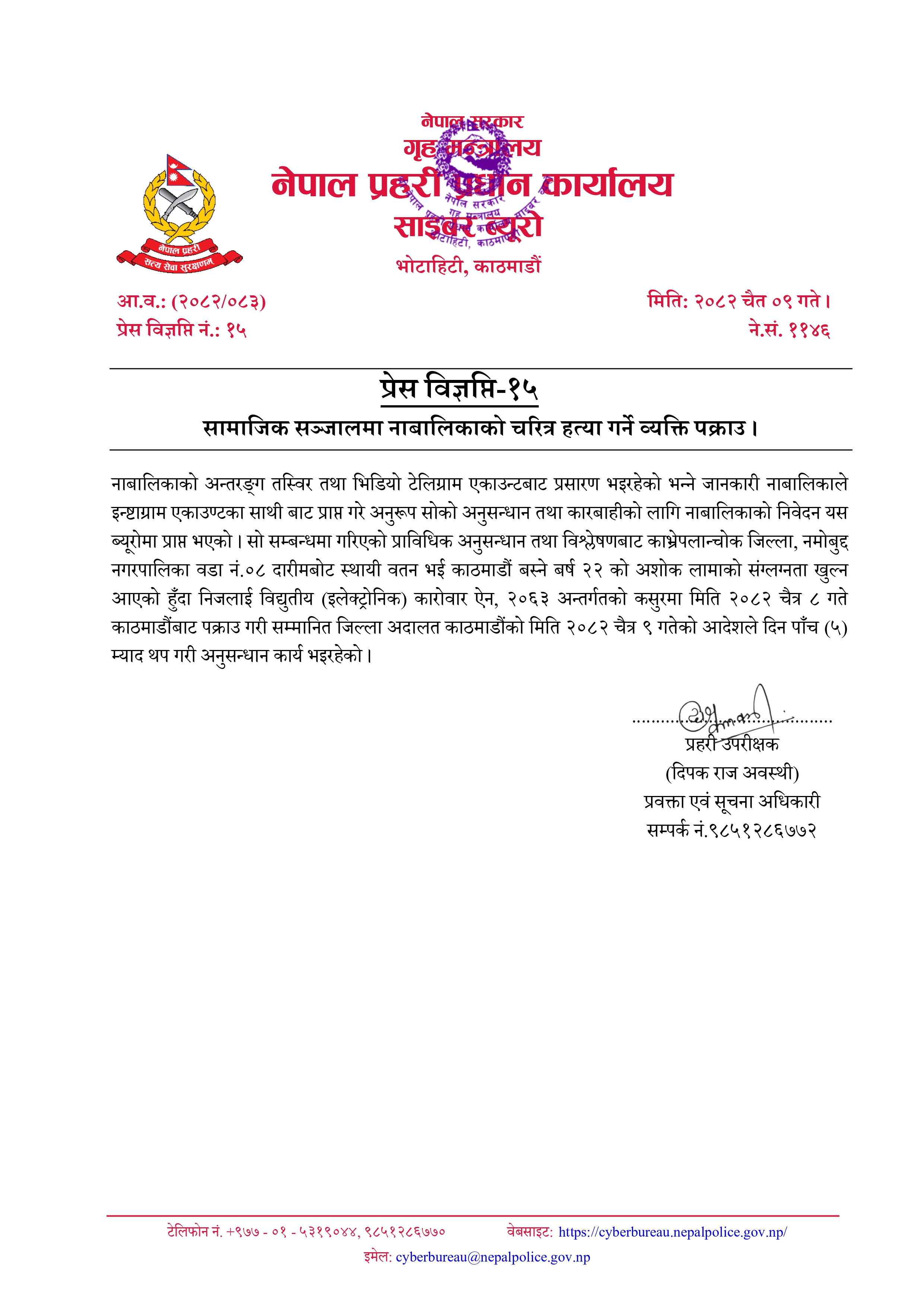 सामाजिक सञ्जालमा नाबालिकाको चरित्र हत्या गर्ने व्यक्ति पक्राउ । (२०८२-१२-०९) २०८२-१२-०९ A A- A+ Share