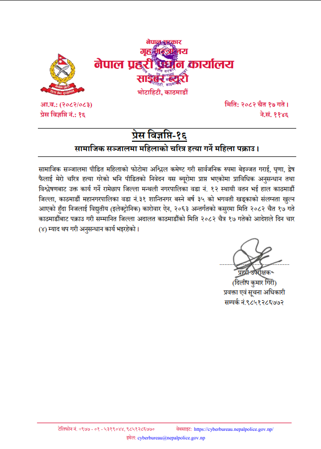 प्रेस विज्ञप्ति-१६ सामाजिक सञ्जालमा महिलाको चरित्र हत्या गर्ने महिला पक्राउ । २०८२-१२-१७ A A- A+ Share प्रेस विज्ञप्ति-१६ सामाजिक सञ्जालमा महिलाको चरित्र हत्या गर्ने महिला पक्राउ ।